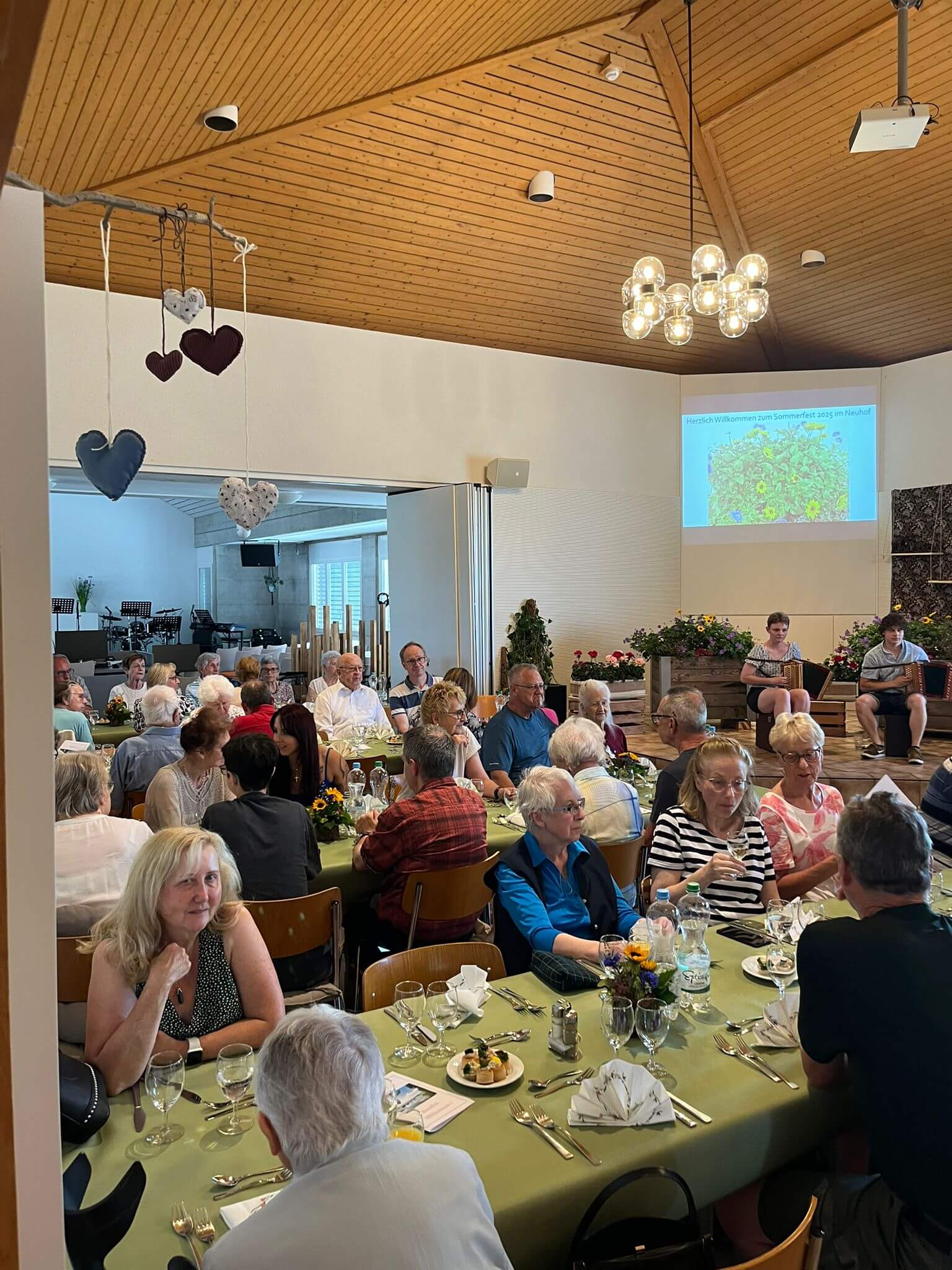 Zum festlichen Anlass sind jeweils neben den Bewohnerinnen und Bewohnern deren Angehörige, freiwillige Mitarbeiterinnen und Mitarbeiter sowie Vorstandsmitglieder des Vereins Wohn- und Alterszentrum Neuhof eingeladen. Gemeinsam gut essen, verweilen, plaudern sind Programm. Die Räume waren wie immer "neuhoflich" schön dekoriert, die Tische festlich gedeckt und die Küche zauberte ein feines Drei-Gang-Menü zum Geniessen. Zwischendurch gab es musikalische Einlagen mit Handörgeli-Musik. Und wer noch nicht genug hatte, konnte bei der Führung durch den Neubau staunen, was da alles am Entstehen ist.