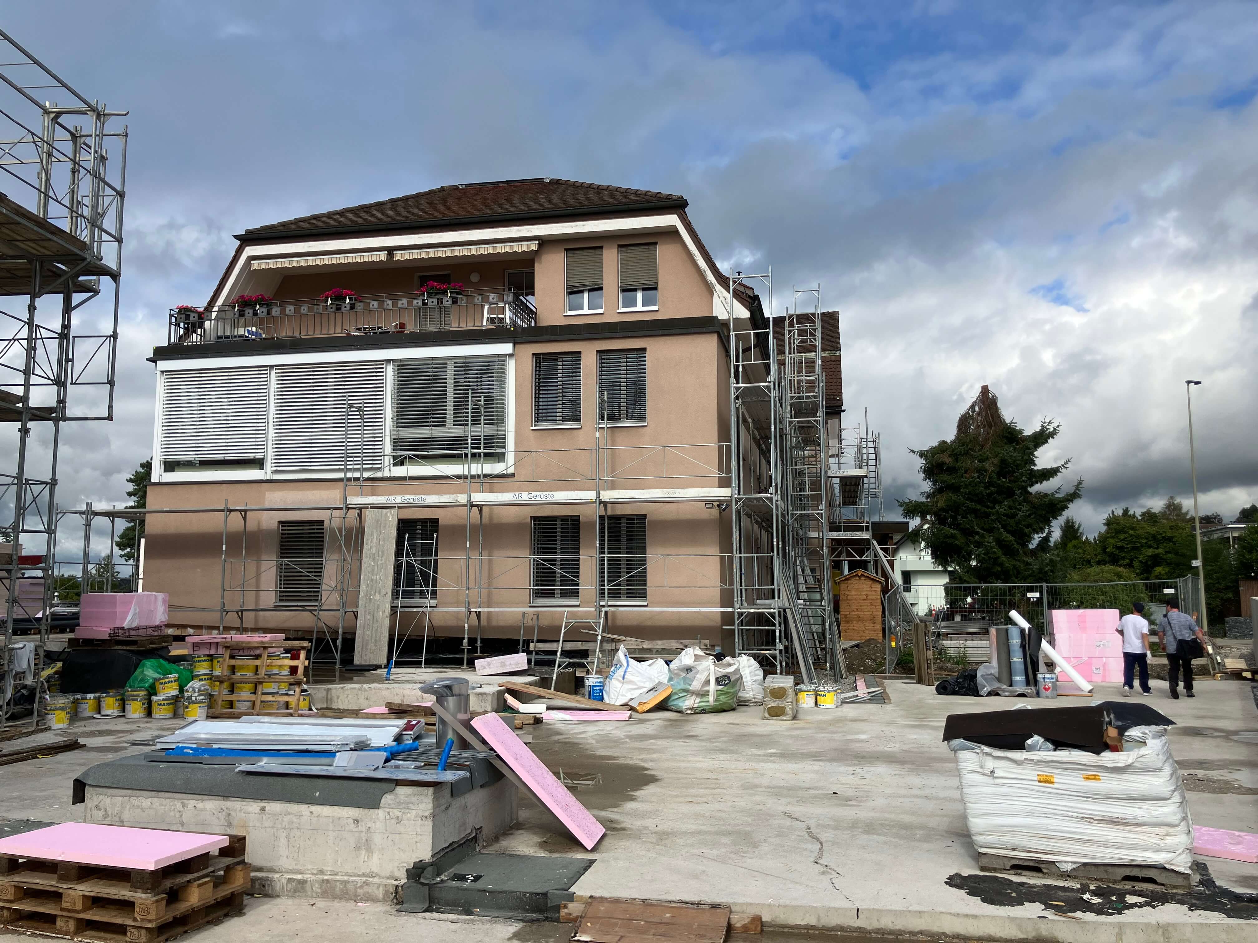 Ab Oktober werden die Aussenarbeiten beginnen und dann wird auch das Gelände Gestalt annehmen. Wir hoffen, dass das Wetter noch etwas mitmacht und bis Ende November alle Fassaden fertig sowie die Gerüste abgebaut sind.